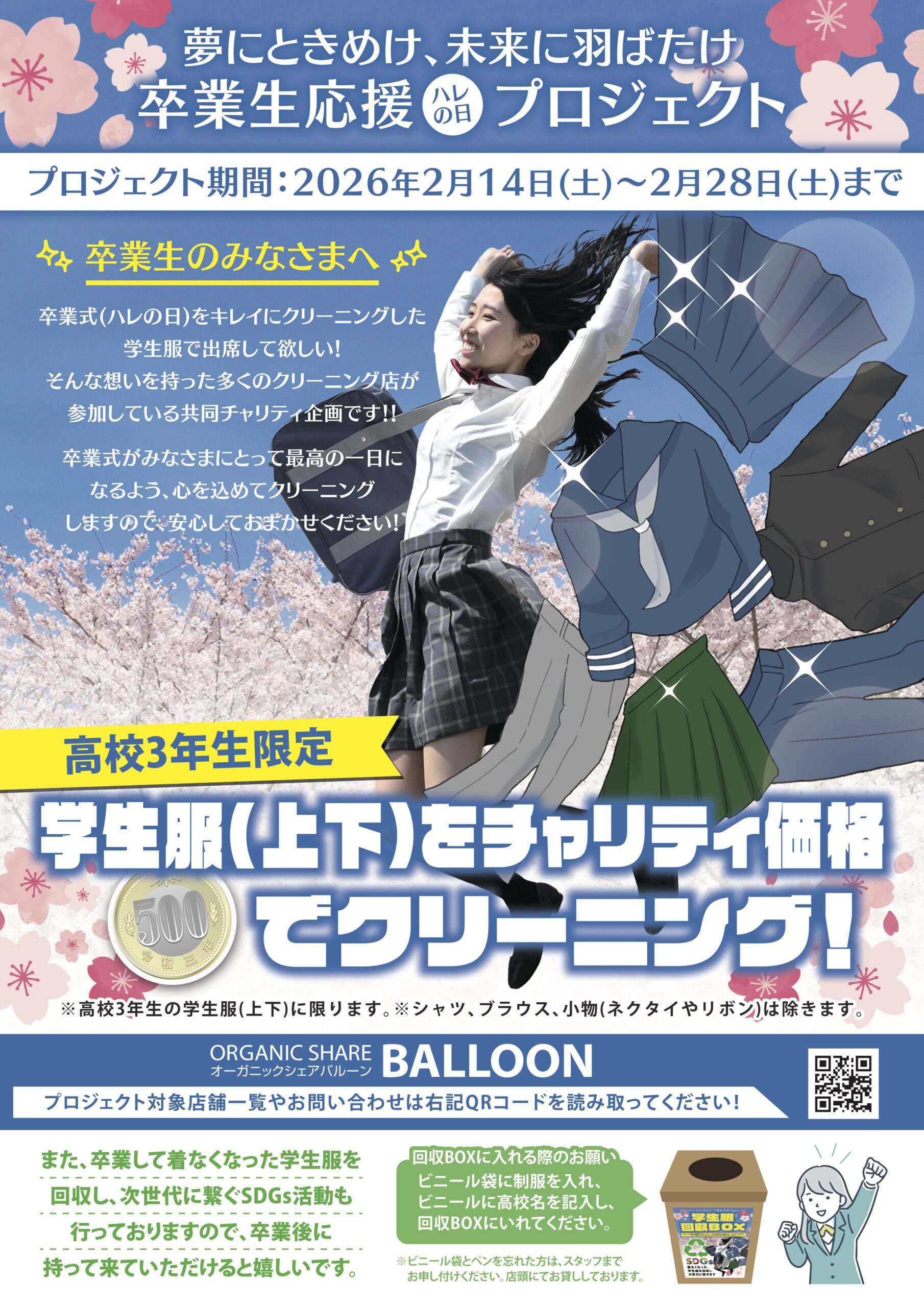 ① 卒業式前:学生服チャリティクリーニング