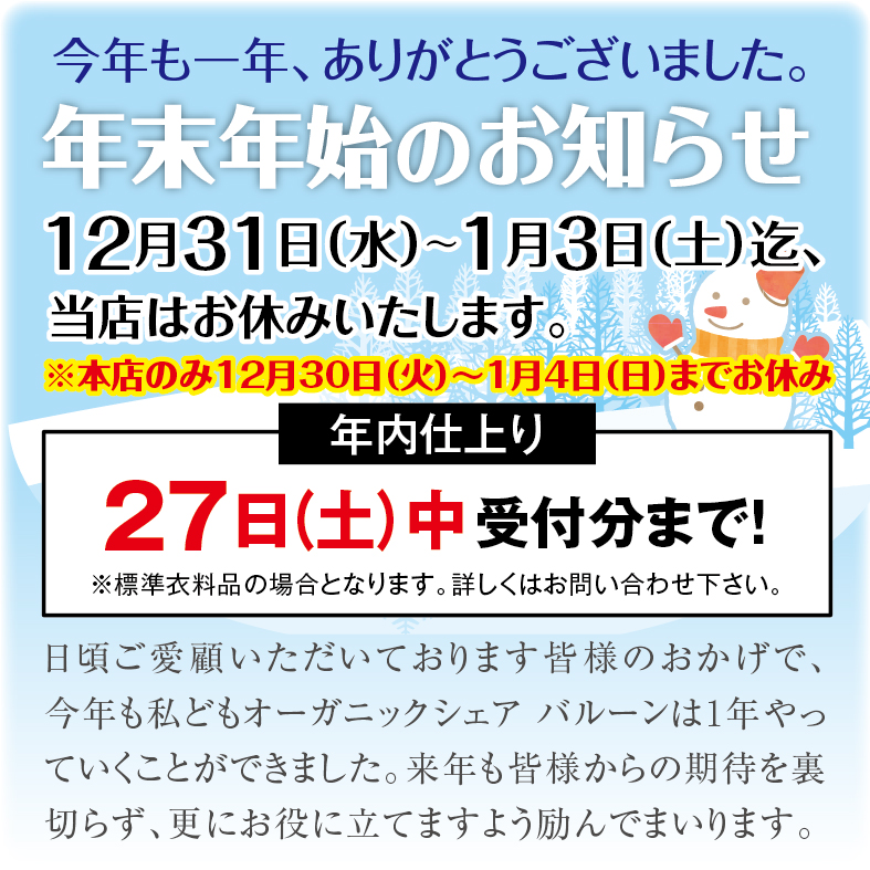 誠に勝手ながら、年末年始の営業および年内仕上がりにつきまして、下記の通りご案内いたします。