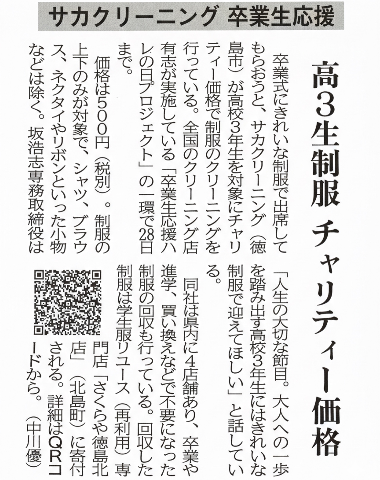 有限会社サカクリーニング(本社:徳島県徳島市、代表取締役:坂 雅弘)は、